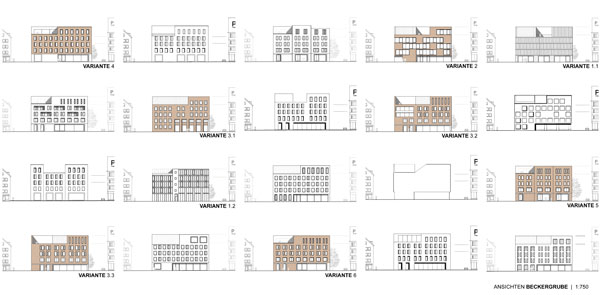 Hierzu wurden für eine existierende Planung umfangreiche Fassadenstudien unternommen mit dem Ziel, für jede der drei Straßen angemessene Antworten zu erhalten. Angestrebt wurde das harmonische Zusammenspiel dreier Einflussfaktoren: Einhaltung der Gestaltungssatzung, Umsetzung des gewünschten Programms und architektonischer Gegenwartsbezug.